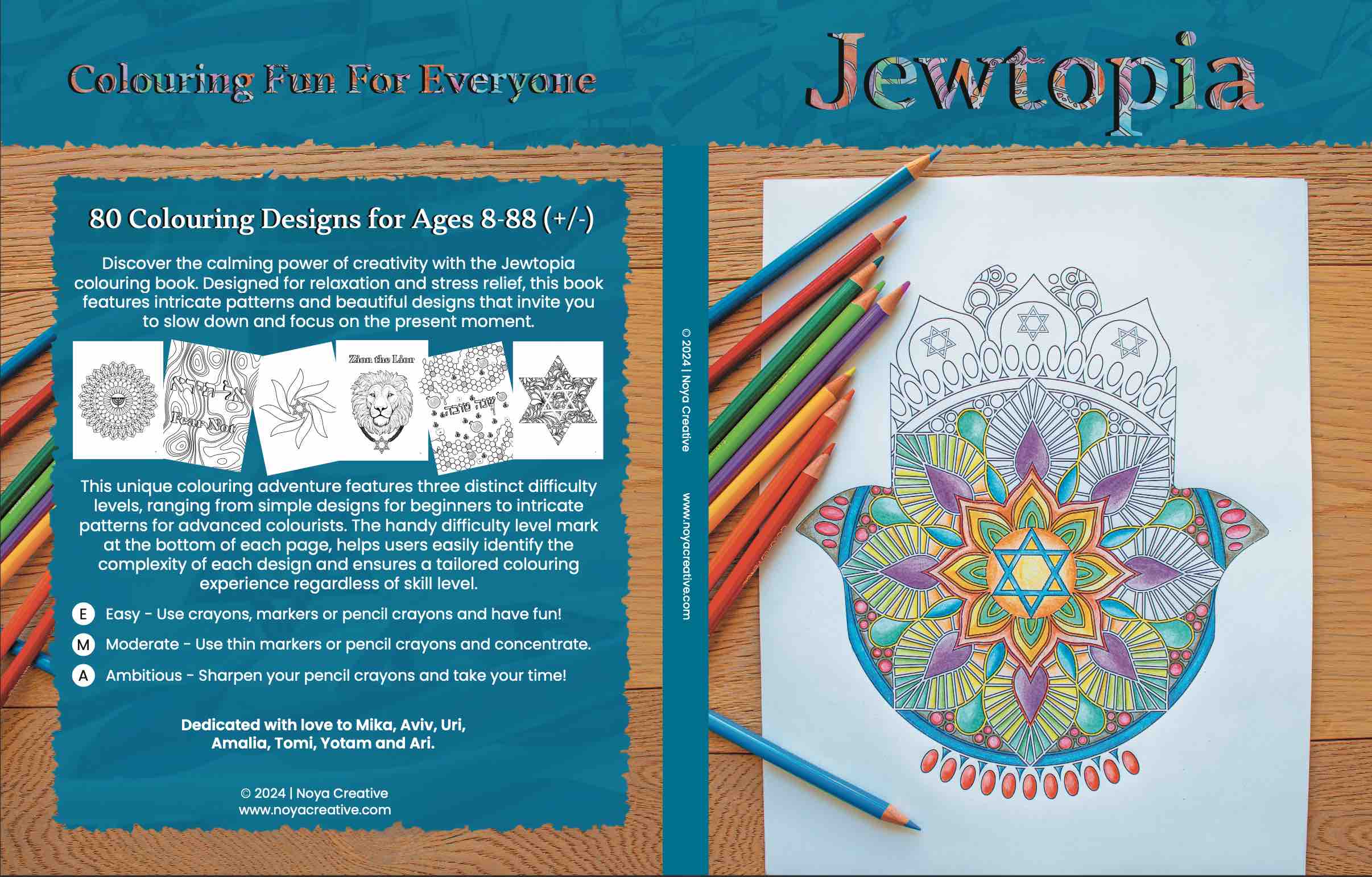 I developed the Jewtopia colouring and journaling kit as a complete print product, from concept through production. The project included curation and editing of more than 80 illustrations, layout design for multiple book formats, cover design, typography, and print preparation. The interior pages were optimized for both visual impact and usability, ensuring clean line quality, balanced composition, and a cohesive look across the entire collection.